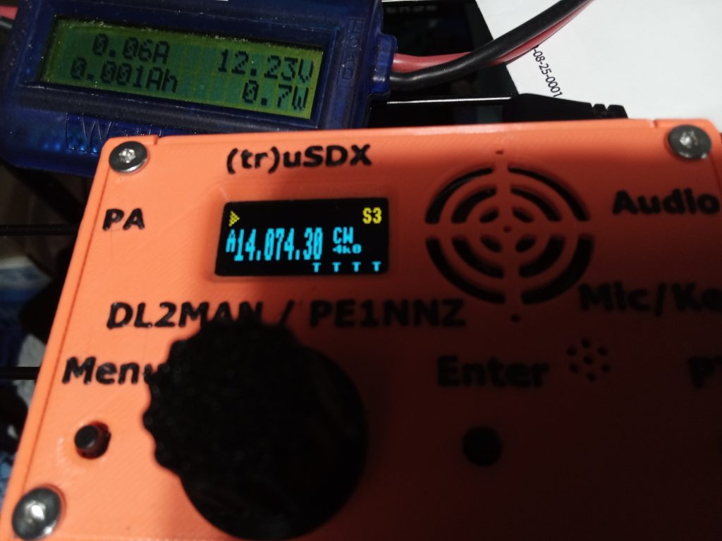 And incidental data from the (tr)uSDX: Transmitting on 20 meters into 50 ohm dummy load @ 11.12 volts, 0.73 amps (8.1 watts) input (measured by the Watt’s Up) gives 5.29 watts out on as measured by the (tr)uSDX itself; or 5.19 watts out measured by the QRPguys meter.