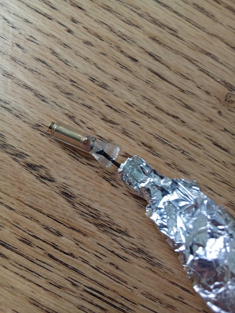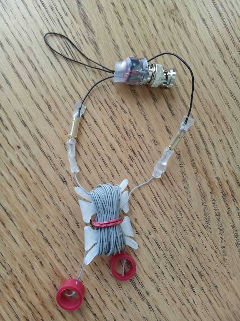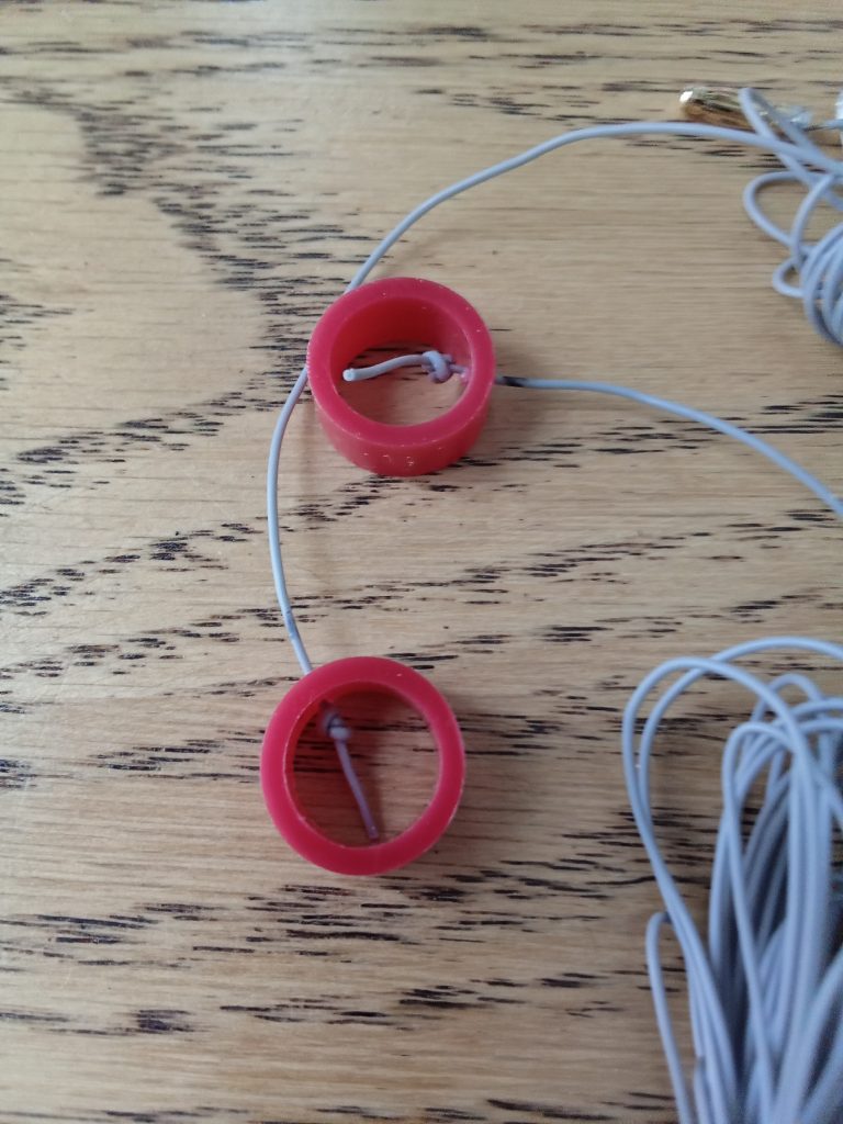 When I took the tape off of the wires to lay out the antenna they immediately tangled up, so I knew I would have to come up with something to wind them up on. I found a little thing that was meant to hold a pair of earbuds …